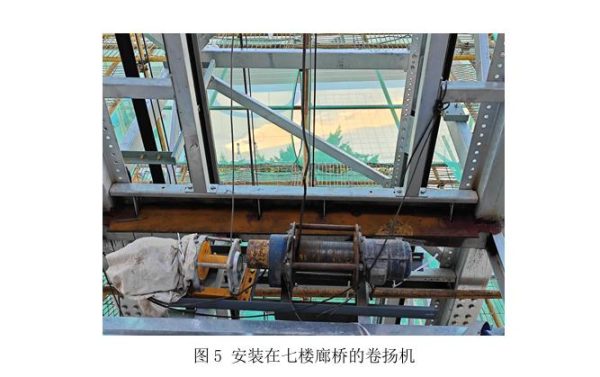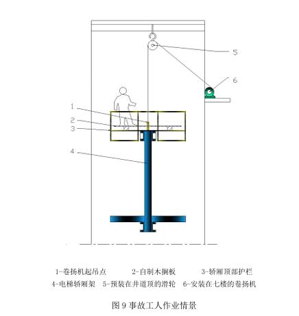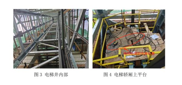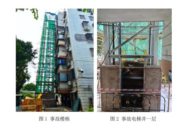 事故电梯建设项目位于城区凤山街道汕尾大道496号居民小区2栋楼梯入口前,该楼栋共8层,电梯建设7层6站6 门,电梯井为钢结构建设,外部玻璃未封装,钢丝绳放置未完成,电梯井与原有建筑间连接廊桥已安装但原建筑外墙尚未打通,电梯井外围脚手架尚未拆除。电梯轿厢位于电梯井底部,轿厢上方安装有木制简易施工作业平台,木制平台因外力冲击已严重变形破裂,平台上可见有散落的卷扬机钢丝绳、一部卷扬机无线遥控器、一部电动扳手,电梯轿厢横梁上绑定有一条起吊带并和卷扬机钢丝绳通过一个D形卡扣连接。电梯七楼廊桥处安装有一台微型电控卷扬机,卷扬机卷筒上钢丝绳已全部释放。事故发生后,覃*生和电梯轿厢一同坠落至电梯井底部,坠落后覃*生头部朝电梯口左内侧,身体仰卧姿态,耳部、面部出血,身体上系有一安全带,安全带另一端未系挂,外部脚手架上见一安全帽。