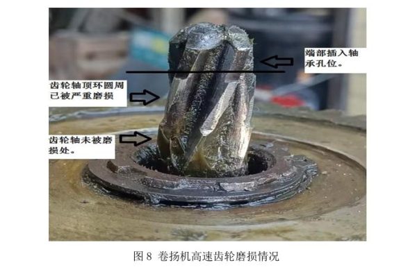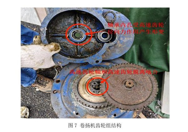 2.设备故障原因。经事故调查组对事故中微型电控卷扬机拆解测验发现,覃*生作业时使用的微型电控卷扬机内部轴承发生塑性形变,造成齿轮组啮合不足,最终导致高速齿轮轴齿顶严重磨损,机器制动失效。[1][2]