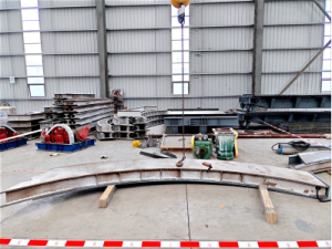 9时11分左右,朱某谋手持起重机遥控器,用起重用短环链(起重机吊钩上的一个可拆分吊具)一端的钢板夹(学名:L系列横吊钢板起重钳)勾住工件的一侧,准备将工件吊起进行翻边作业。谢某军拉住工件上的电缆线,防止被翻转的工件压坏。此时,工件突然翻转,吊工件的钢板夹松脱,并向工件翻转方向的反向甩过去。工件翻转时,“月芽尖”(图一C点、图二箭头处)部位往上挑,挑到朱某谋右腿根部,朱某谋身体被挑起摔倒在地,翻转的工件掉落砸在朱某谋身上。
